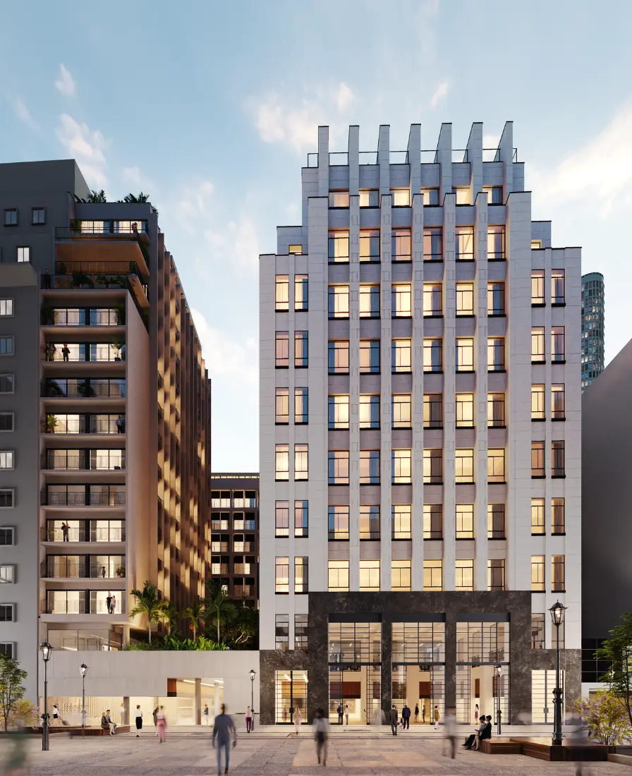 Basílio 177 is São Paulo's most celebrated retrofit — a 1930s art-deco landmark originally designed by Ramos de Azevedo and Severo Villares, now transformed into a luxury residential complex with rooftop pool, sky bar, coworking spaces, a food hall, and 4.20-meter heritage ceilings.
